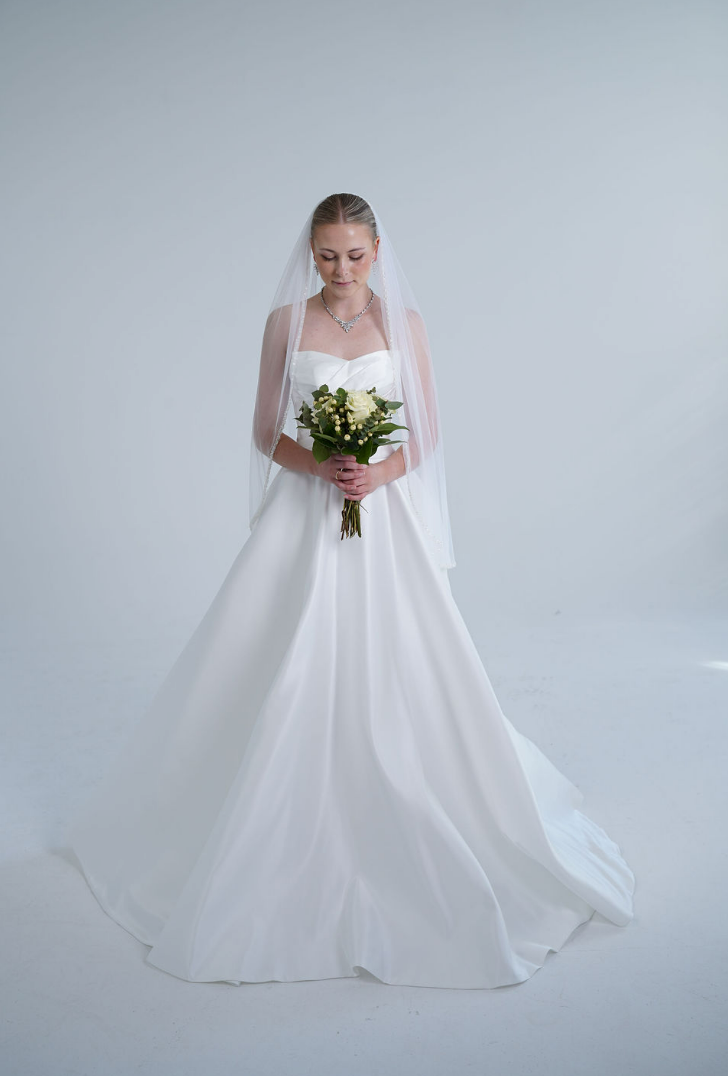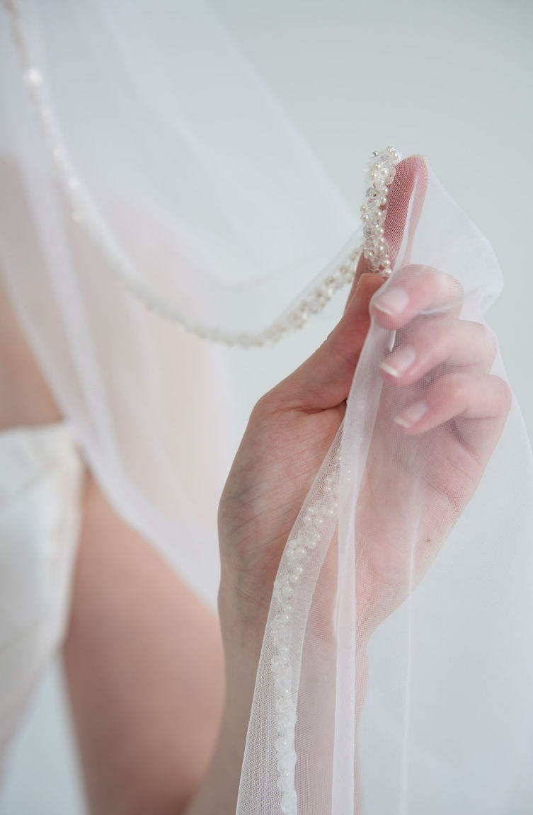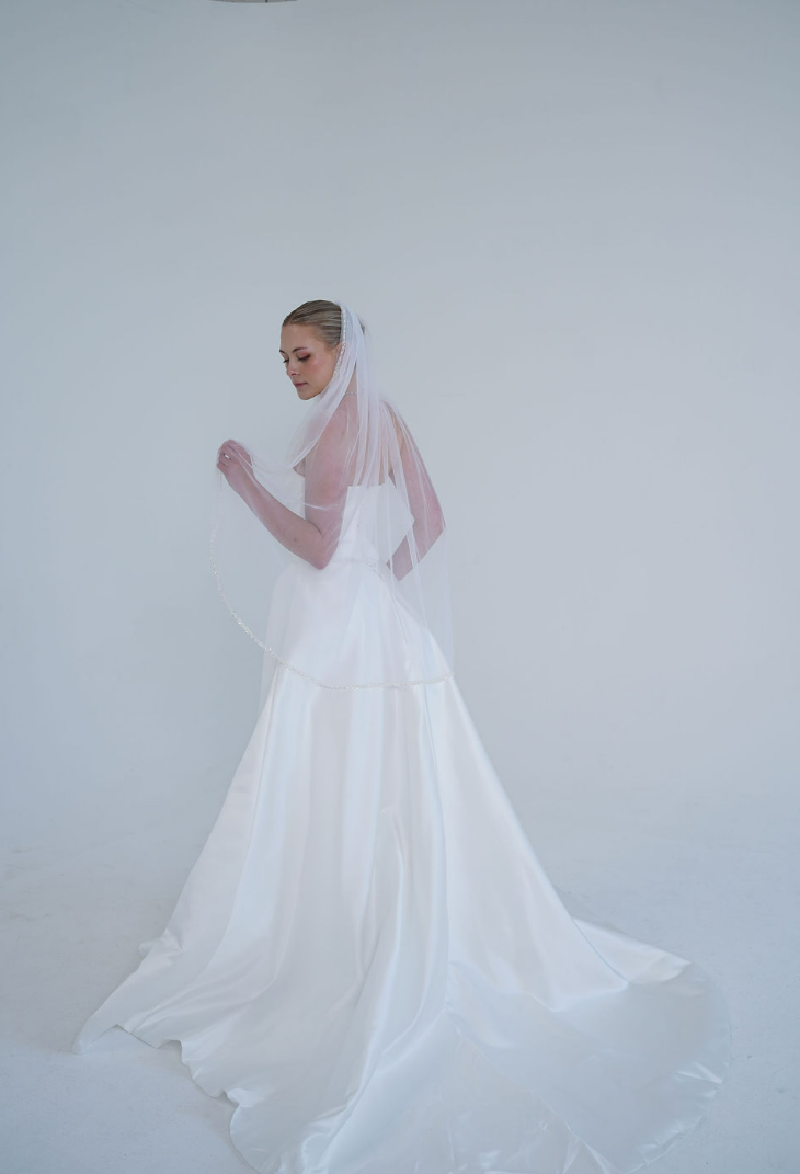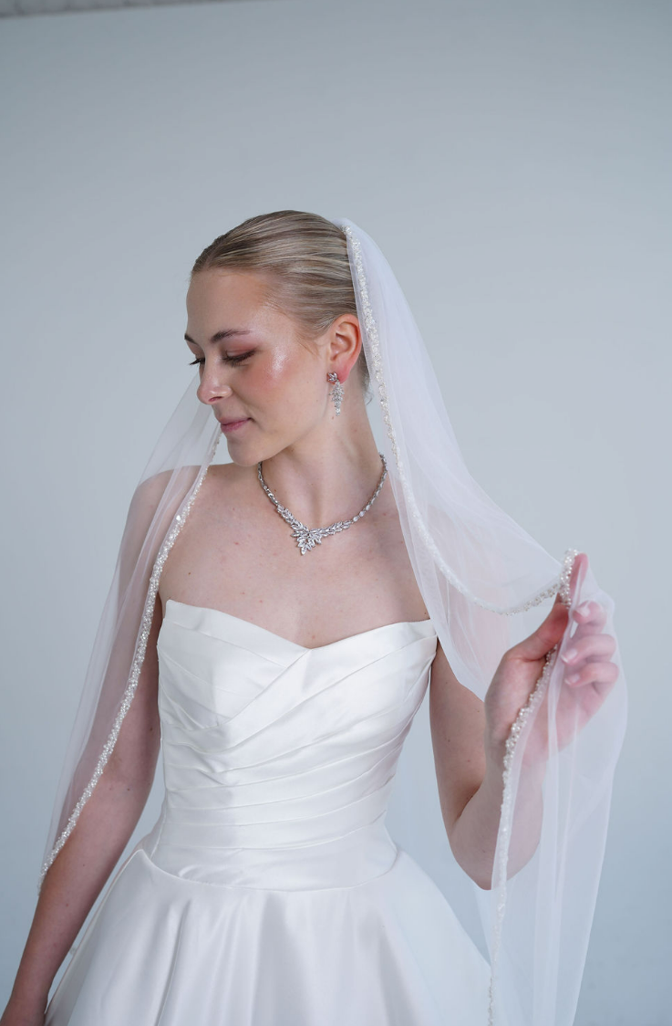 Eleganter, einlagiger Brautschleier aus feinem, transparentem Tüll mit zarter Perlen- und Paillettenborte entlang der Kante. Der Schleier fällt sanft über die Schultern und rahmt das Gesicht harmonisch ein. Durch sein zeitloses Design passt er perfekt zu klassischen und modernen Brautkleidern und verleiht jedem Brautlook einen dezenten, romantischen Glanz. Ideal für Bräute, die eine stilvolle und edle Ergänzung zu ihrem Kleid suchen.