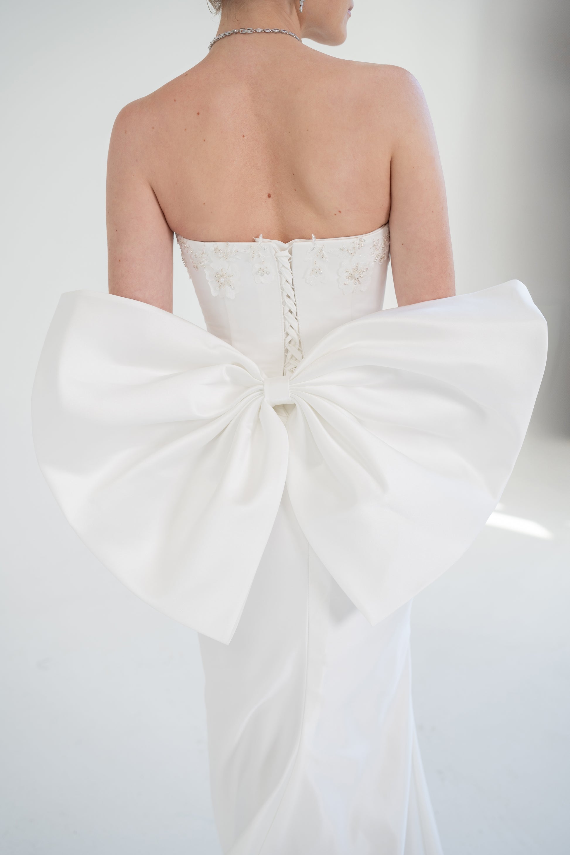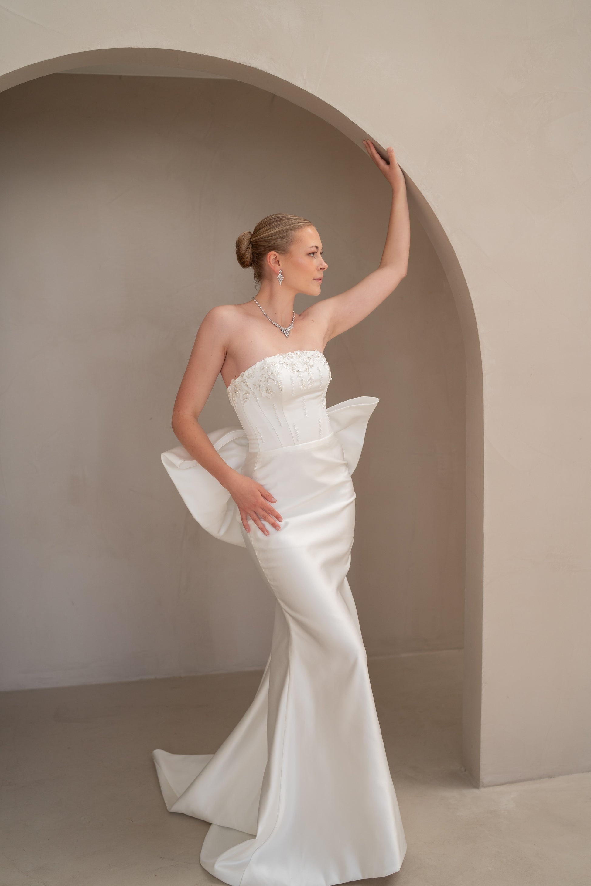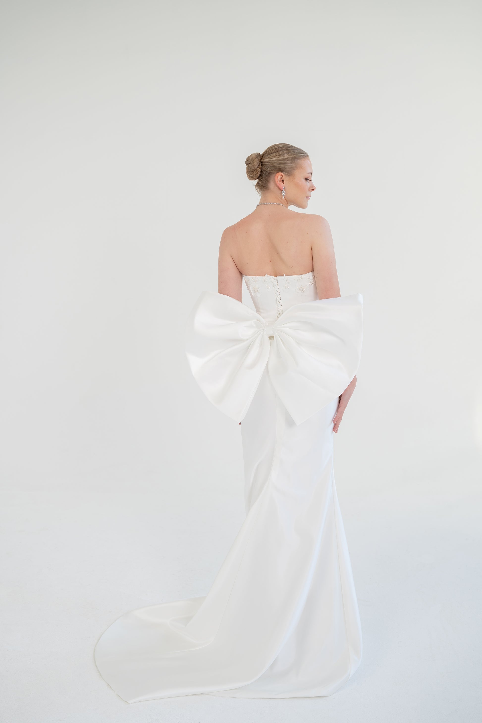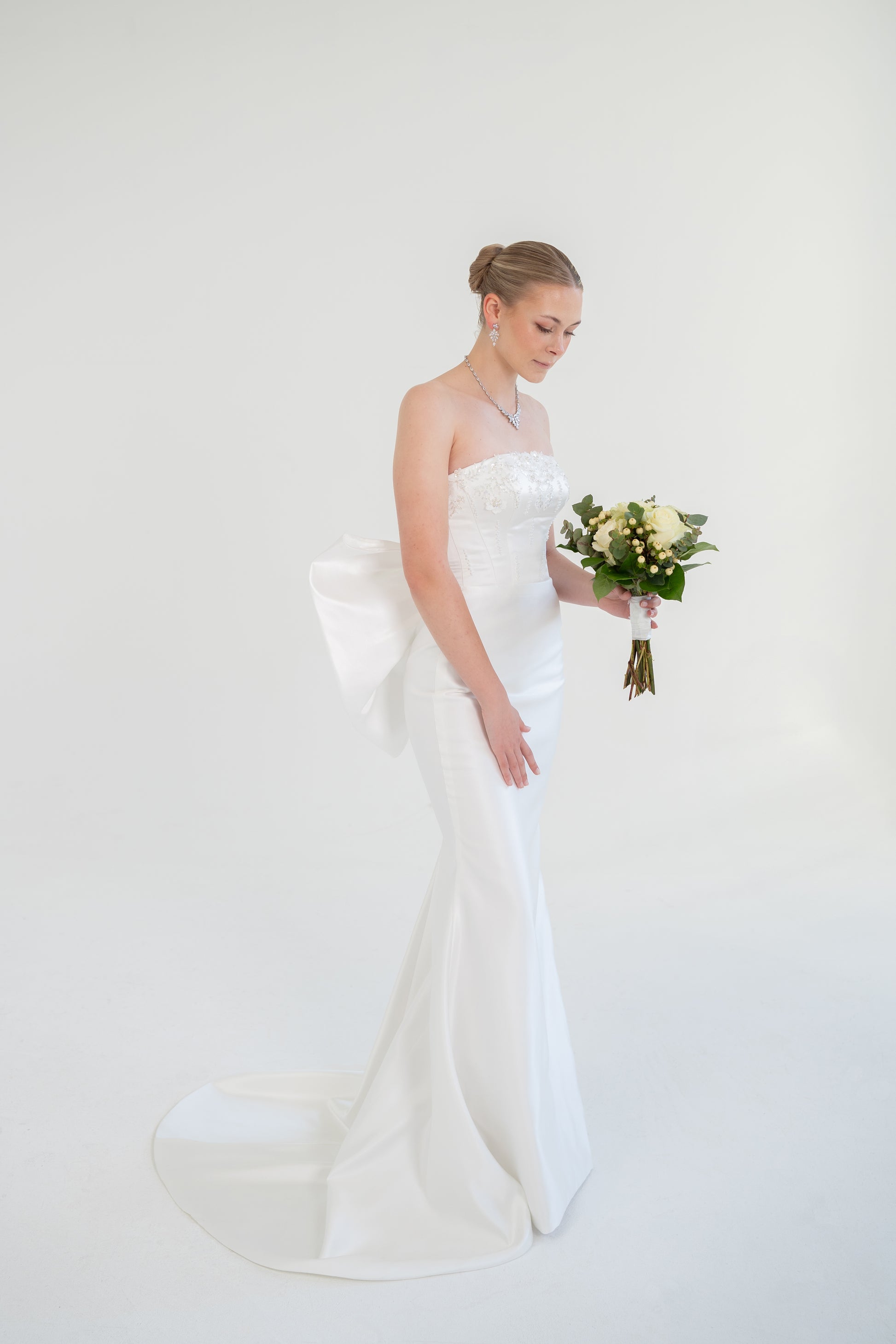 Dieses traumhafte Brautkleid verzaubert mit seiner femininen Silhouette im eleganten Meerjungfrauenschnitt. Das figurbetonte Design mit schulterfreiem, herzförmigem Ausschnitt zaubert ein edles Dekolleté und betont die Taille auf stilvolle Weise. Zarte Spitzenapplikationen am Oberteil sorgen für einen romantischen Touch, während die Rückansicht mit einer eindrucksvollen, großen Schleife das absolute Highlight bildet. Der leicht glänzende Stoff und die fließende Schleppe verleihen dem Kleid eine glamouröse Note.