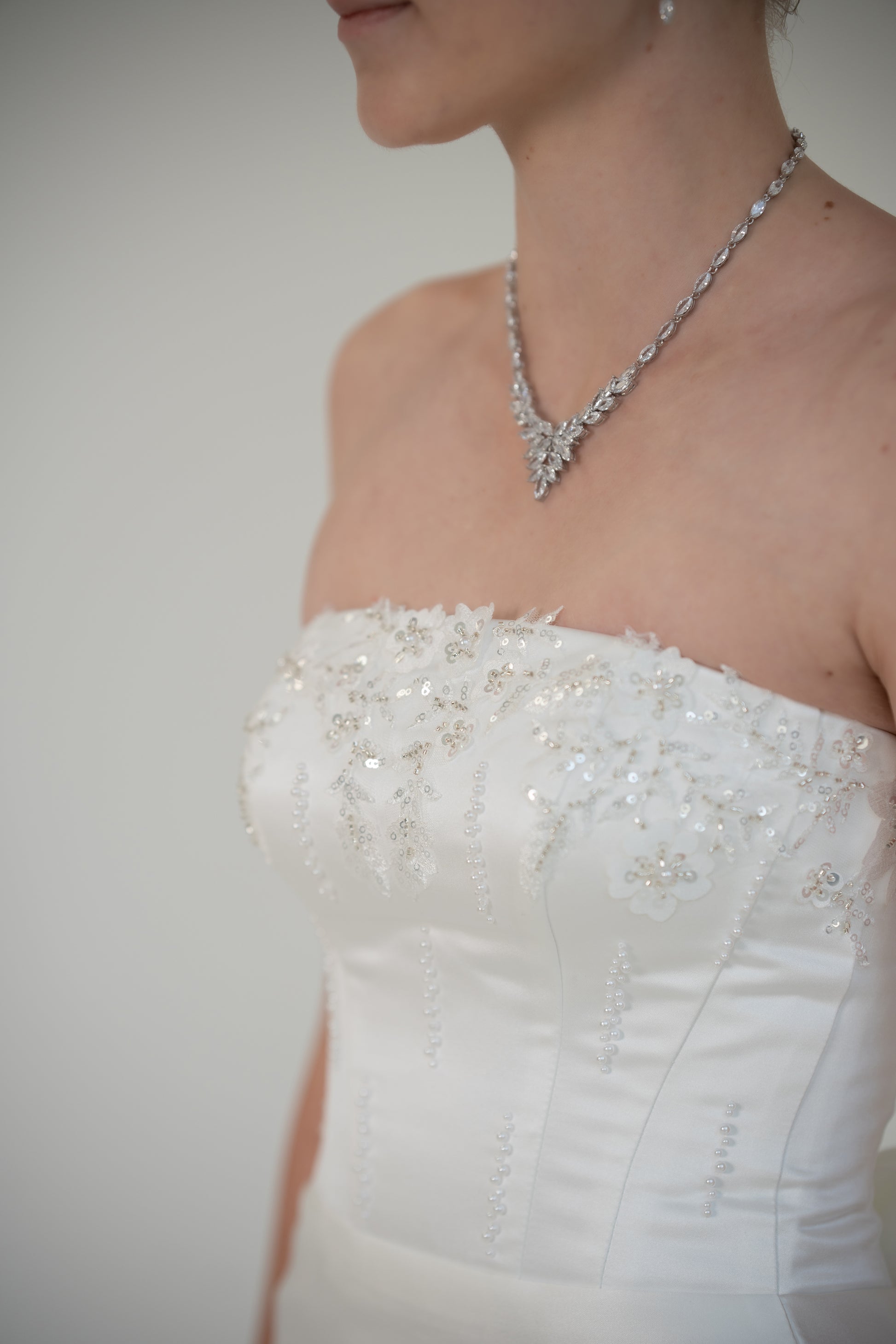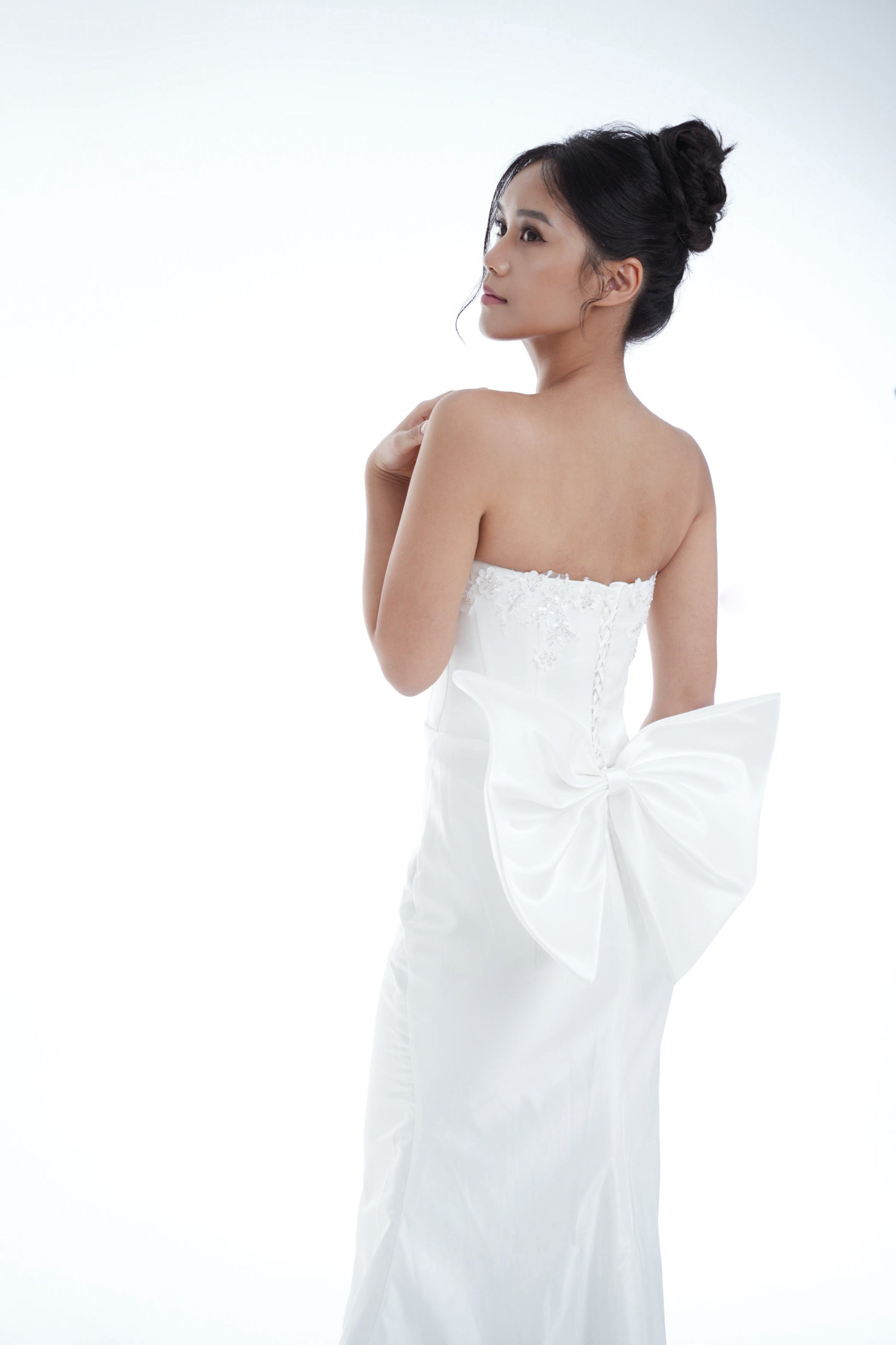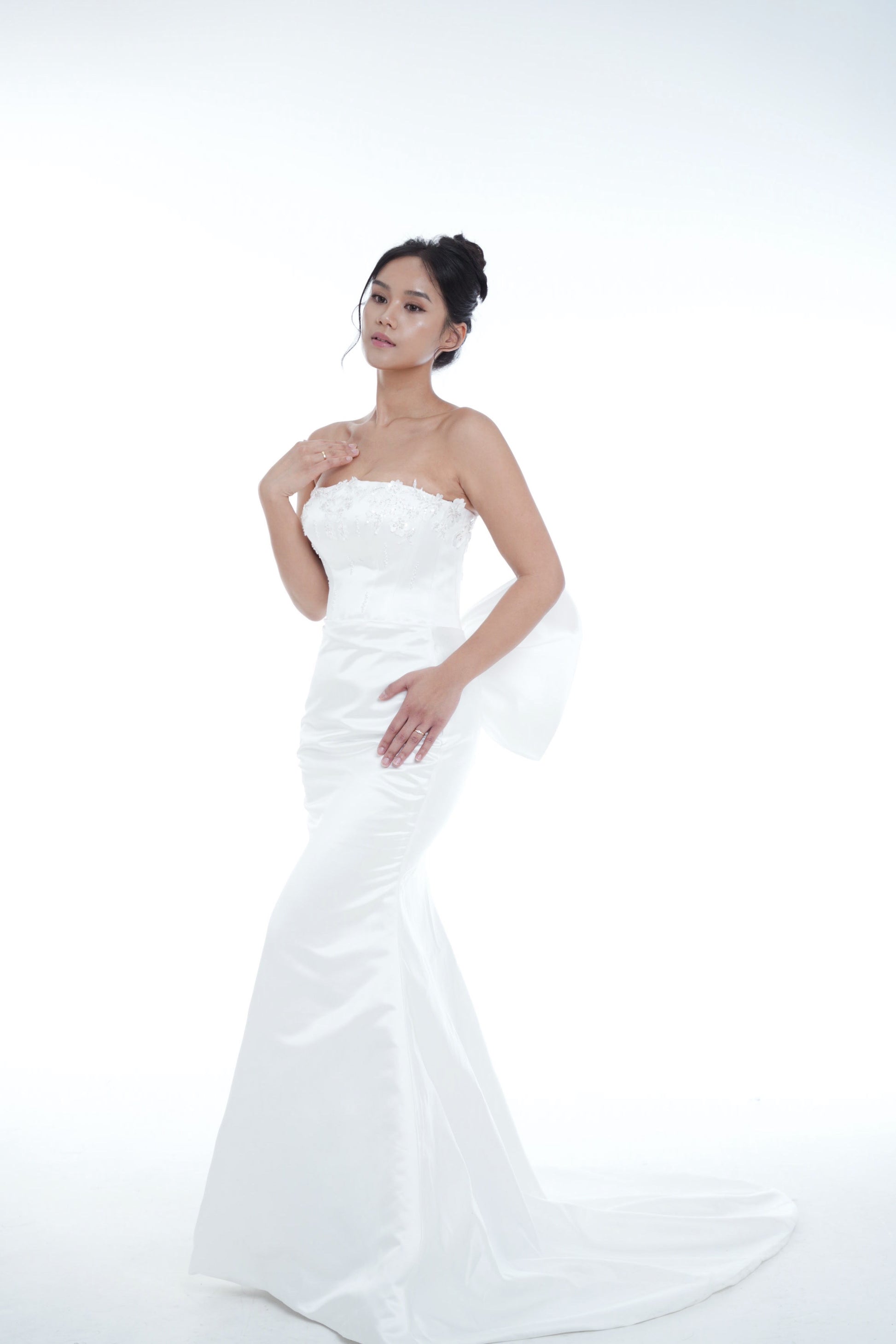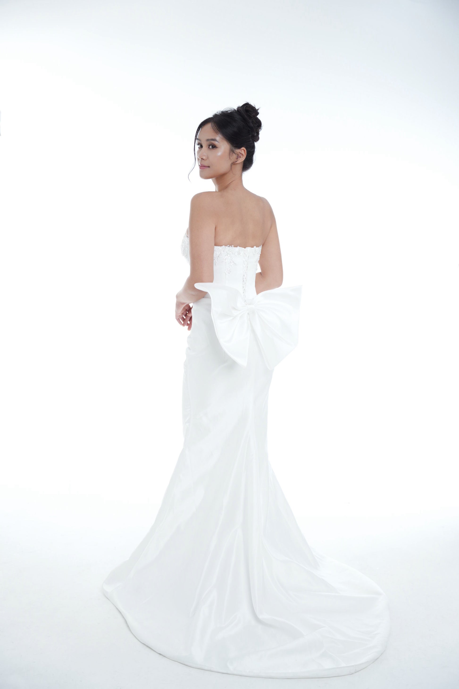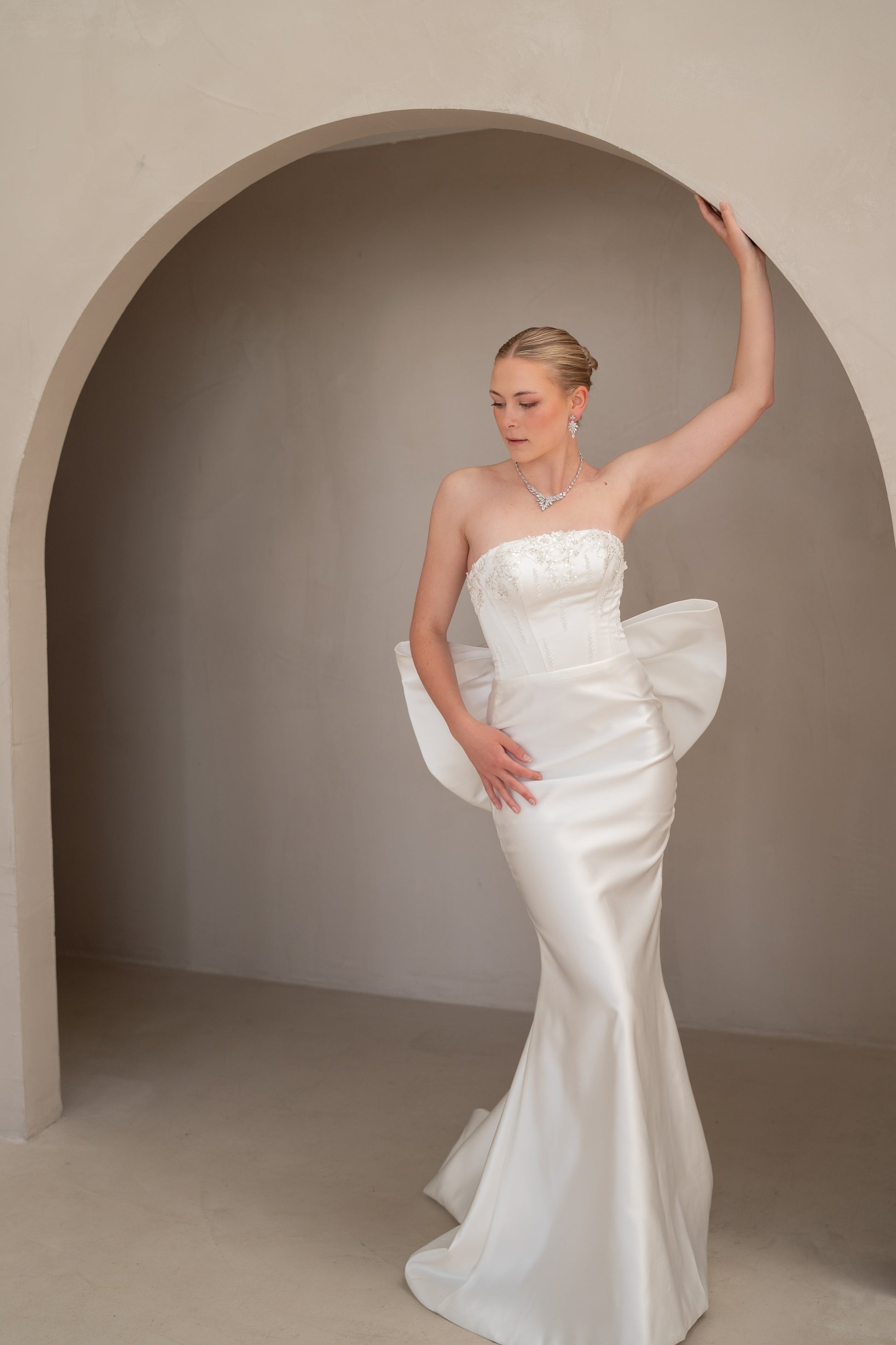 Dieses traumhafte Brautkleid verzaubert mit seiner femininen Silhouette im eleganten Meerjungfrauenschnitt. Das figurbetonte Design mit schulterfreiem, herzförmigem Ausschnitt zaubert ein edles Dekolleté und betont die Taille auf stilvolle Weise. Zarte Spitzenapplikationen am Oberteil sorgen für einen romantischen Touch, während die Rückansicht mit einer eindrucksvollen, großen Schleife das absolute Highlight bildet. Der leicht glänzende Stoff und die fließende Schleppe verleihen dem Kleid eine glamouröse Note.