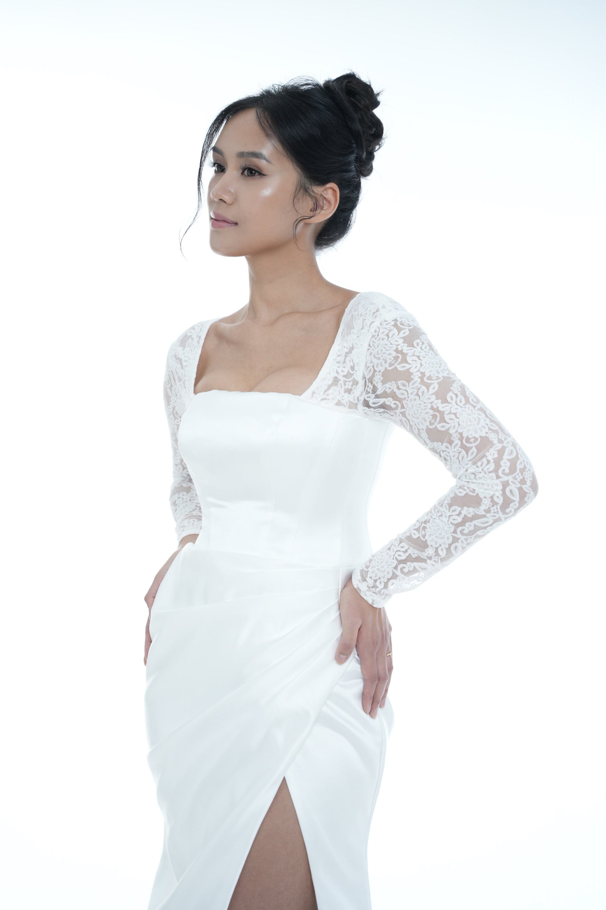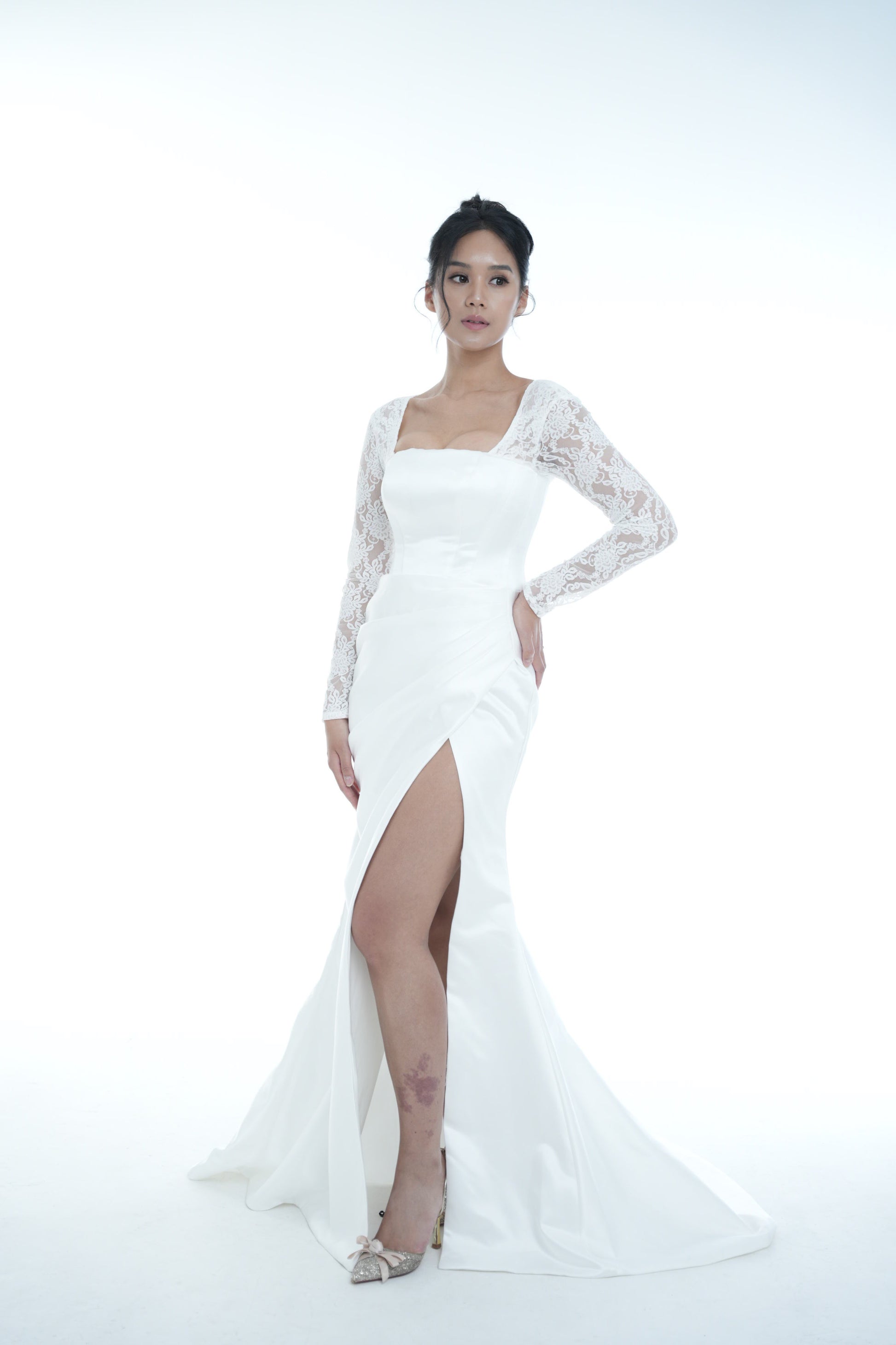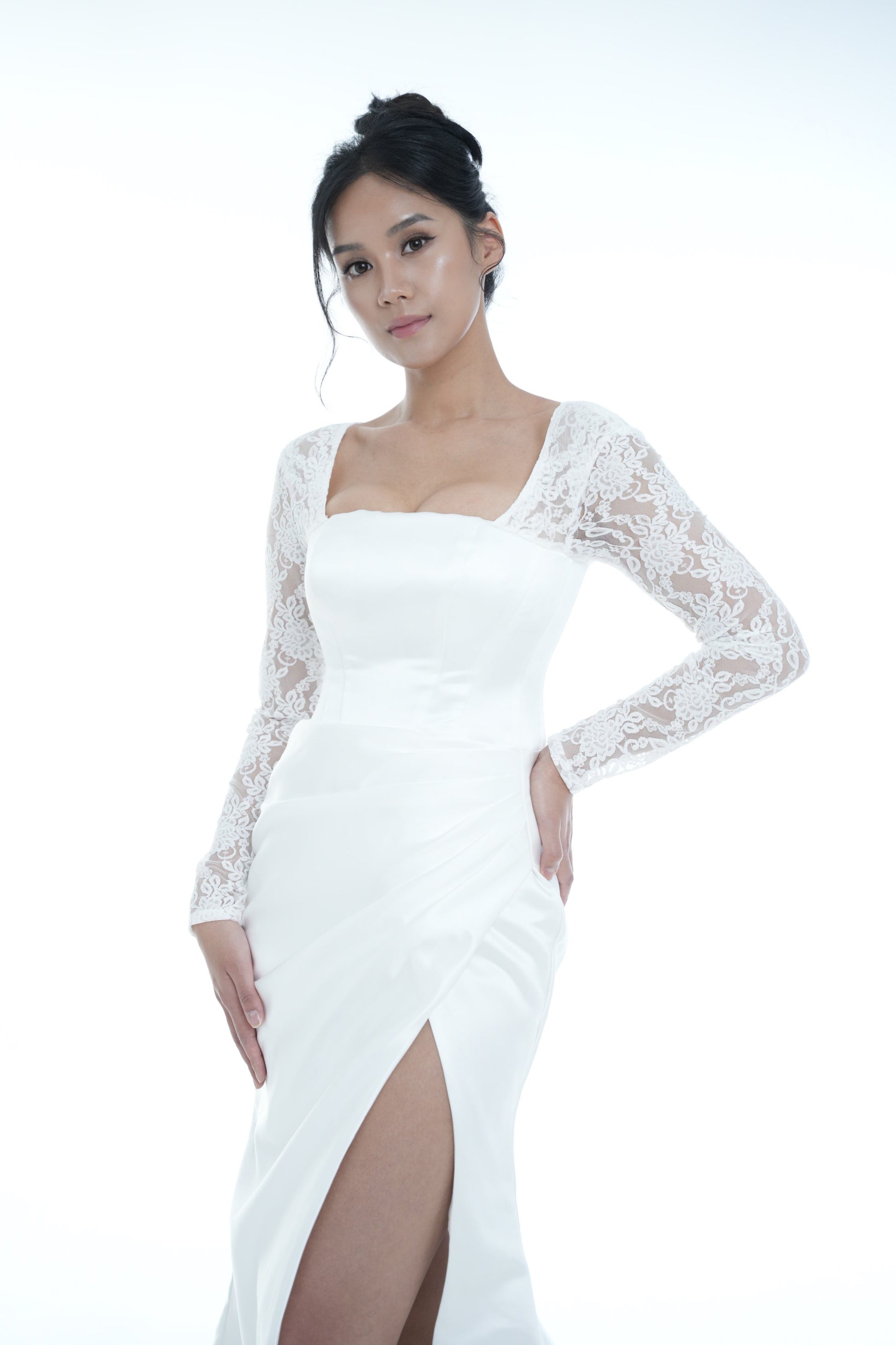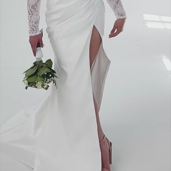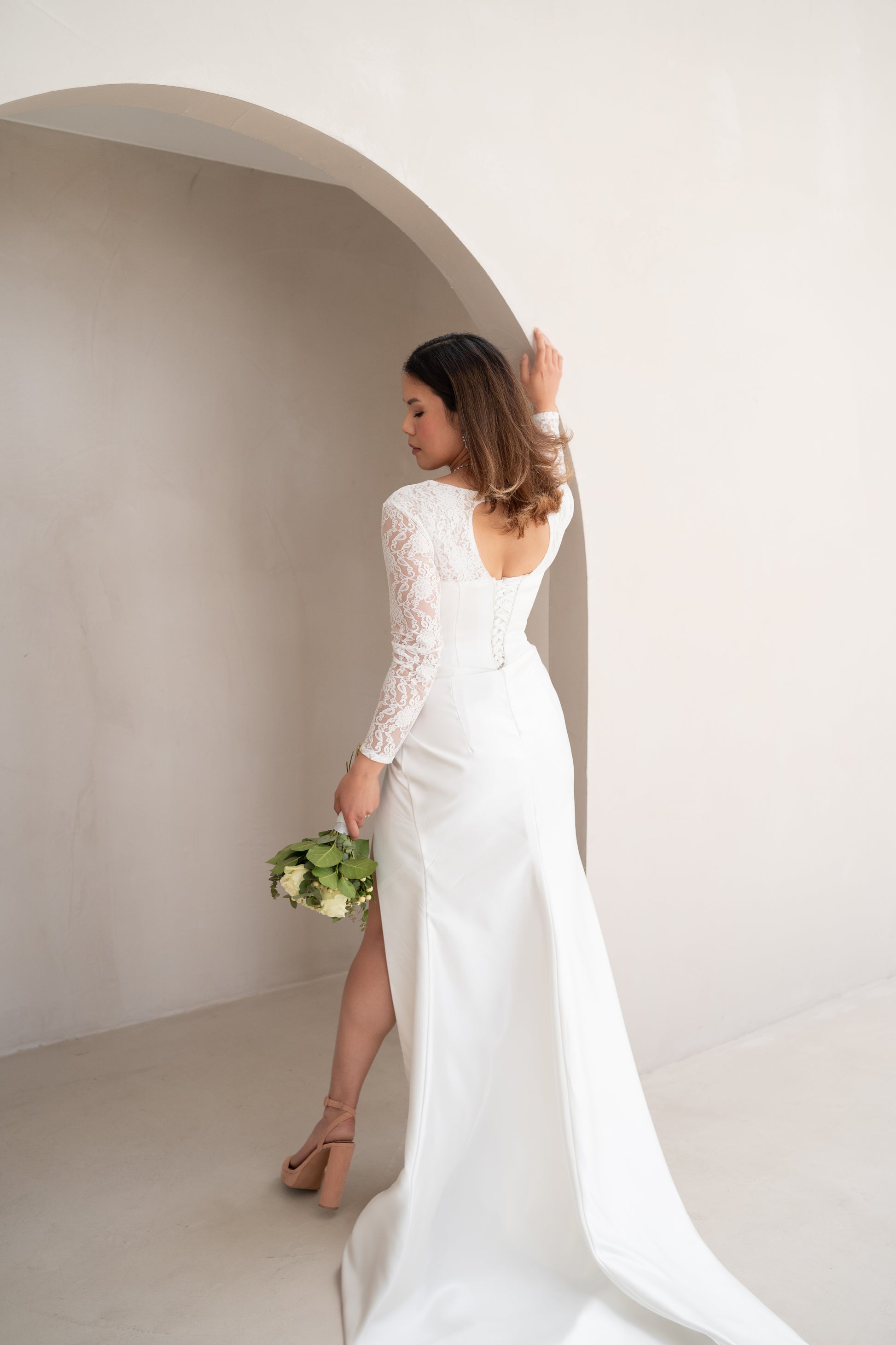Brautkleid mit Ärmel aus Spitze und Beinschlitz